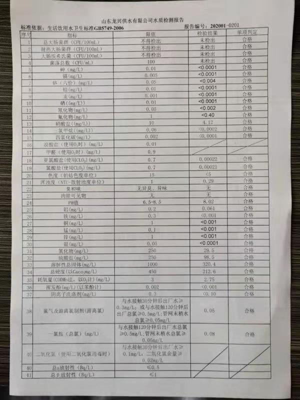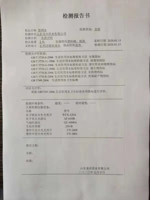 2020年1月億利潔能管網水龍頭水質月檢報告