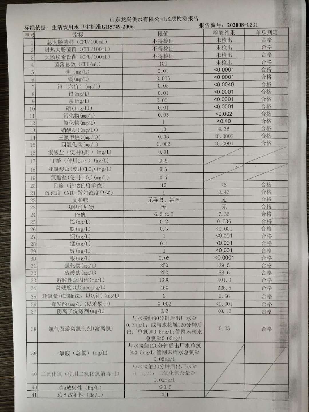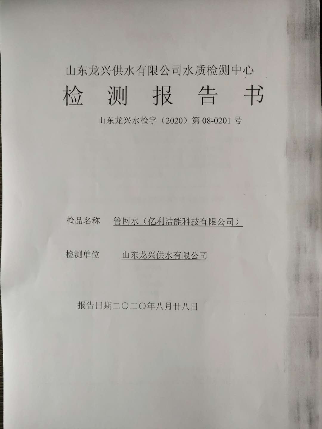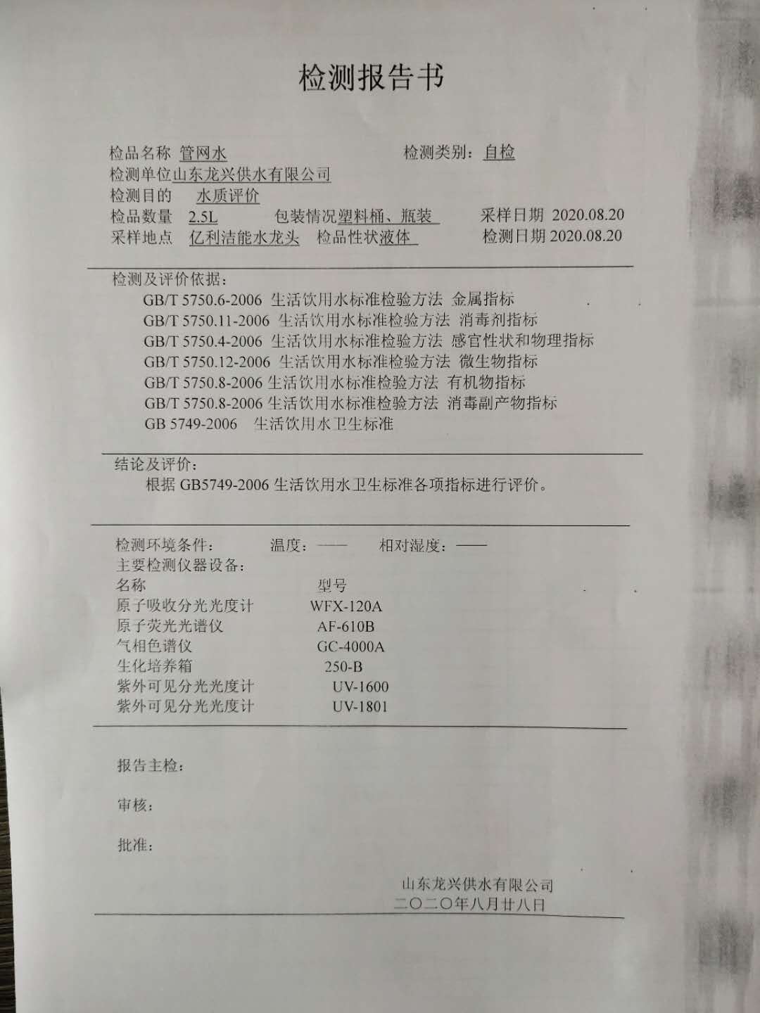 2020年8月管網水月檢報告